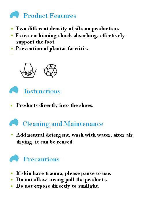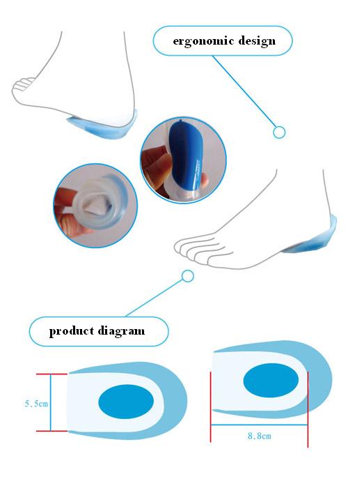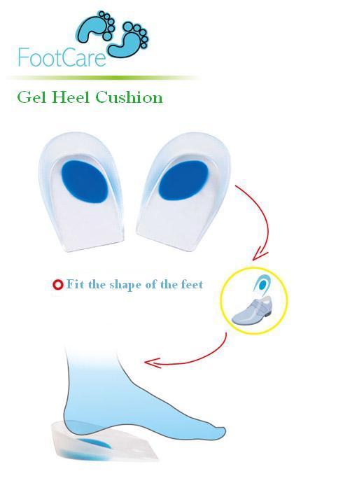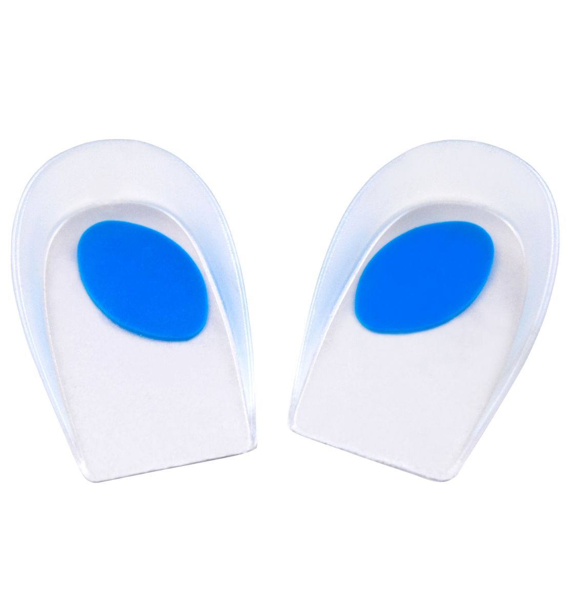 ● Different shapes available ● 100% silicone gel cup fits perfectly in the heel area of your shoe for heel, ankle, knee and back relief. ● Durable, medical-grade cushions absorb forces that aggravate heel pain and put extra load on joints. ● Technologically advanced cushions cradle the heel. ● An extra soft blue silicone insert offers additional relief to painful areas. ● When placed directly under heel pad, soft density dot absorbs shock and vibration, and evenly distributes pressure. |