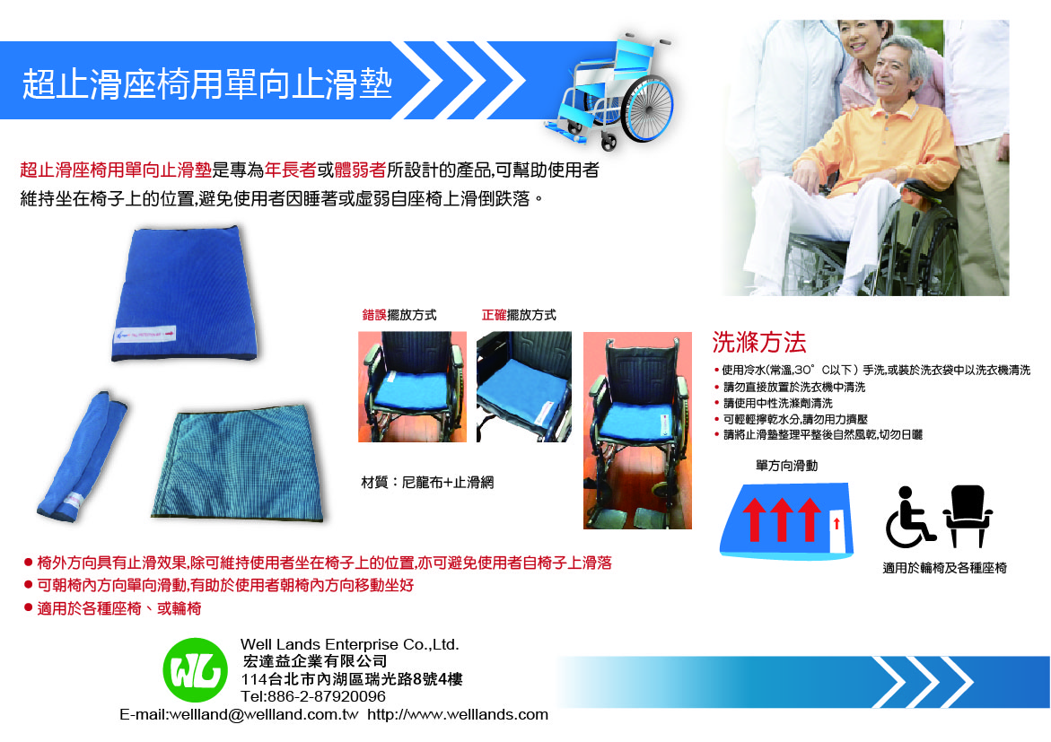 箭頭方向朝椅內可往內移動,可幫助使用者往椅背方向移動坐好,反向則止滑
