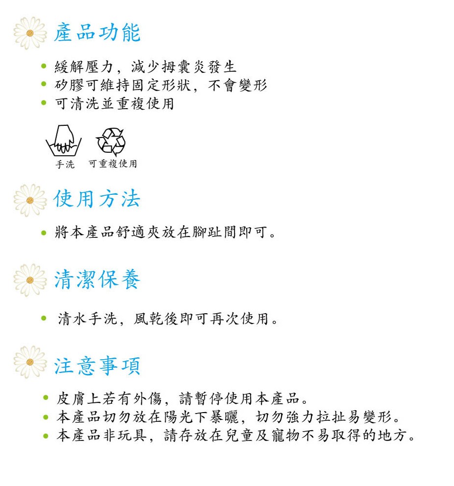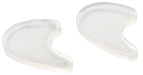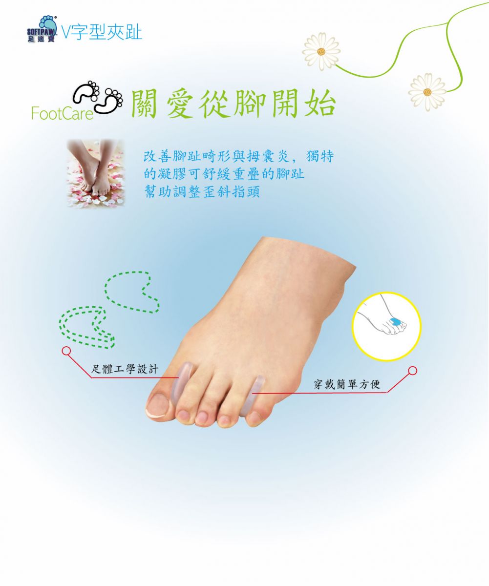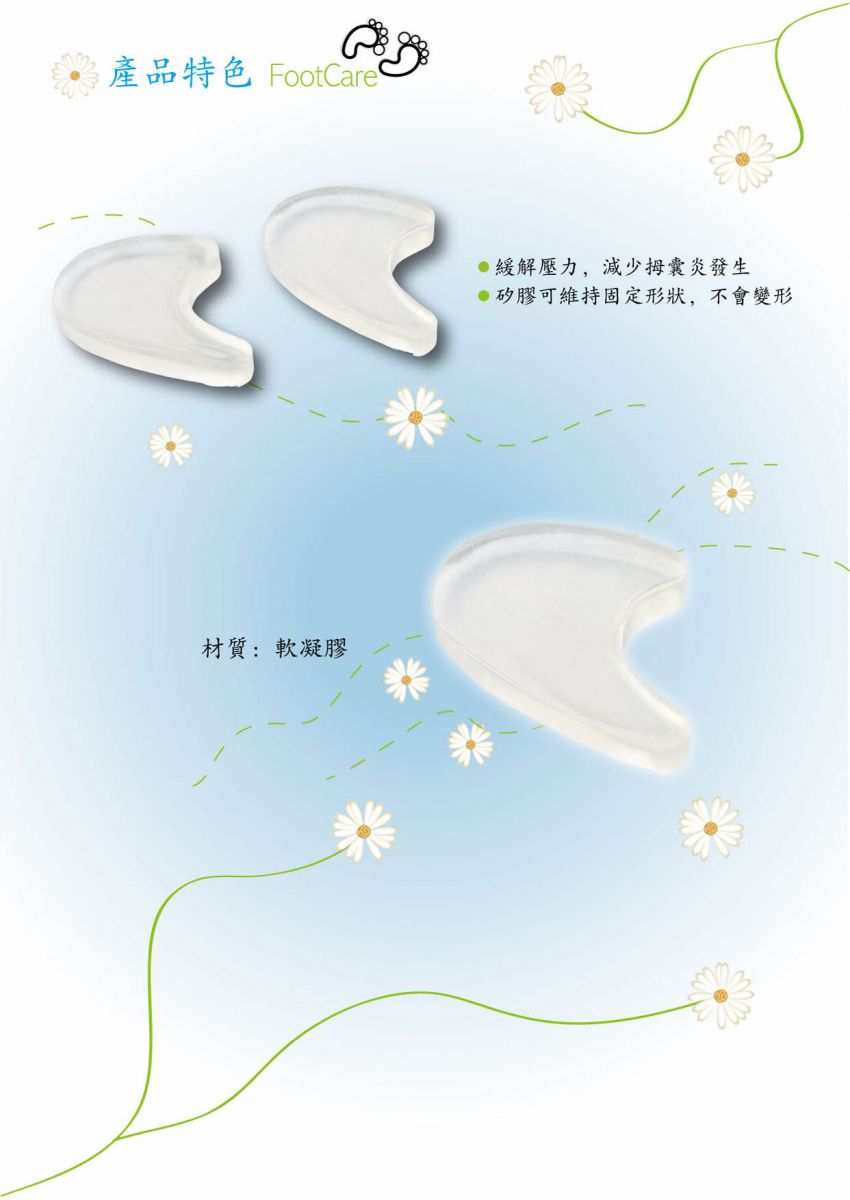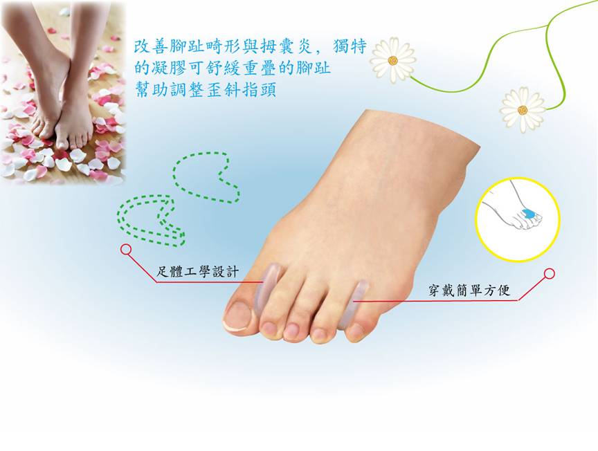 可藉由軟矽膠材質的分離輔助墊,將已移位或緊靠的腳拇指分離,進而分散腳拇指過度集中的壓力。